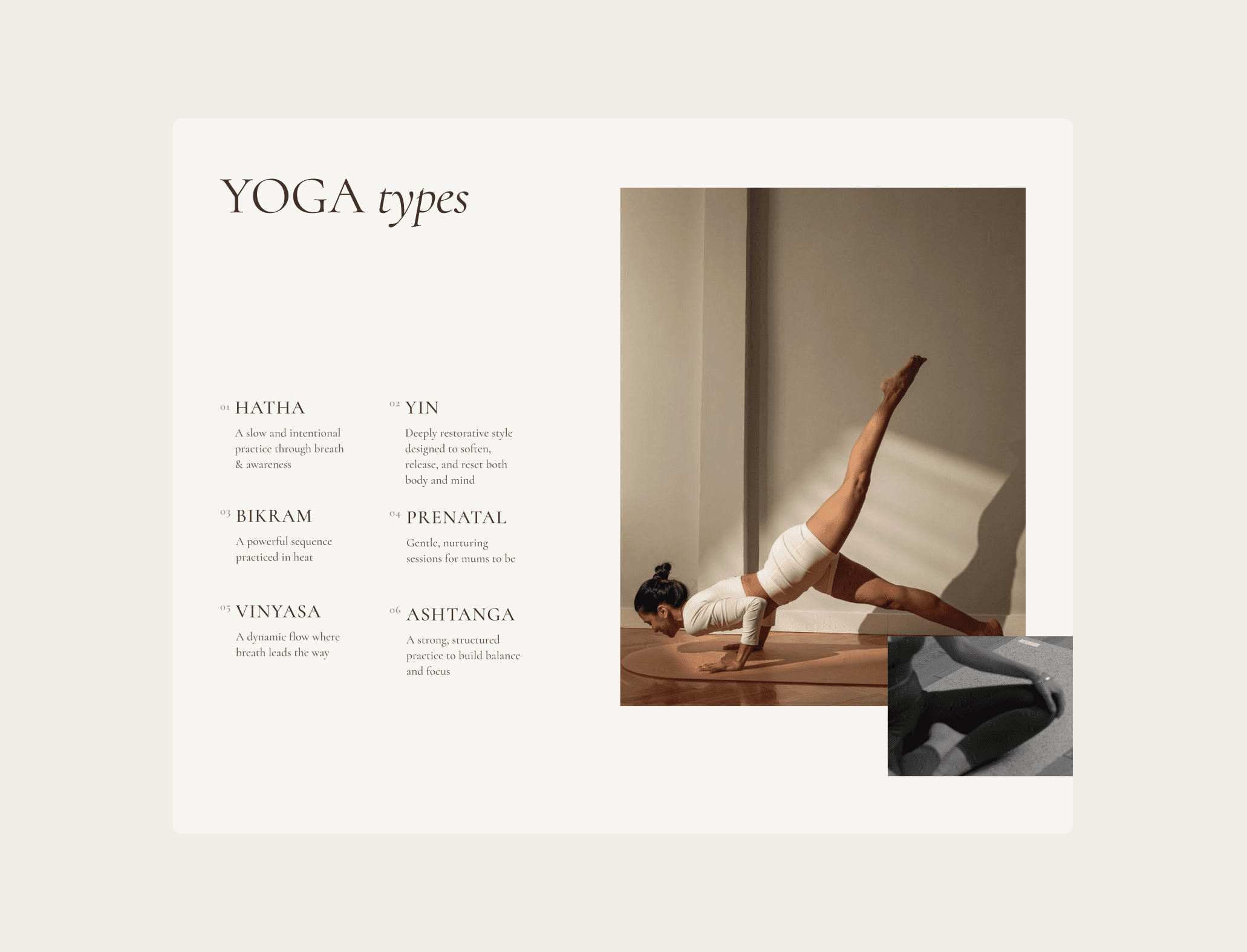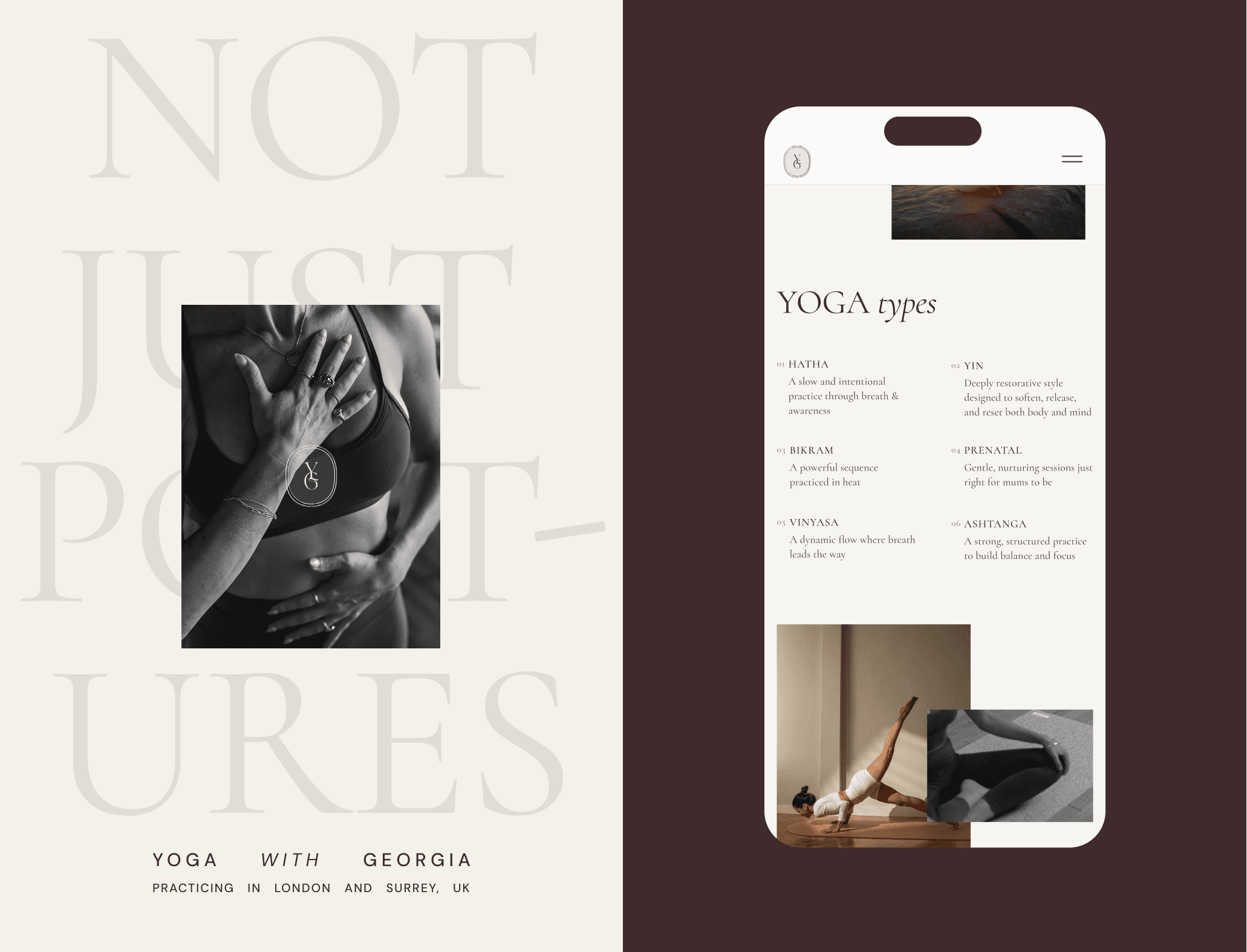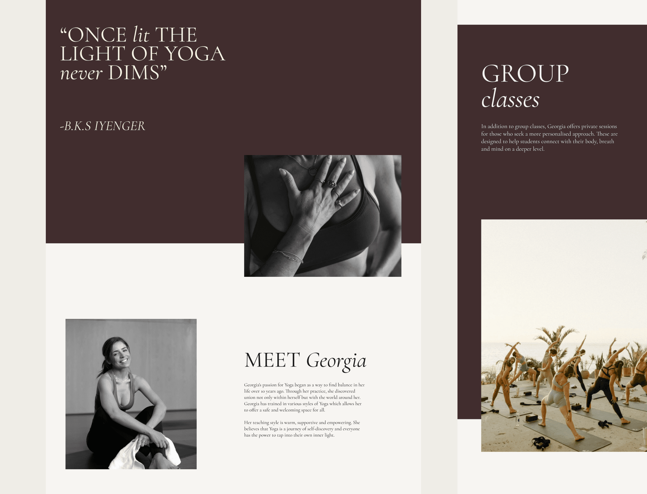 A mix of desaturated colour imagery and black-and-white photography keeps the site feeling natural and grounded, while the serif typography; shifting between regular and italic…reflects both the stillness and flow of yoga itself. The result is a gentle, intentional identity and website that feels calm, approachable, and truly reflective of Georgia’s practice.