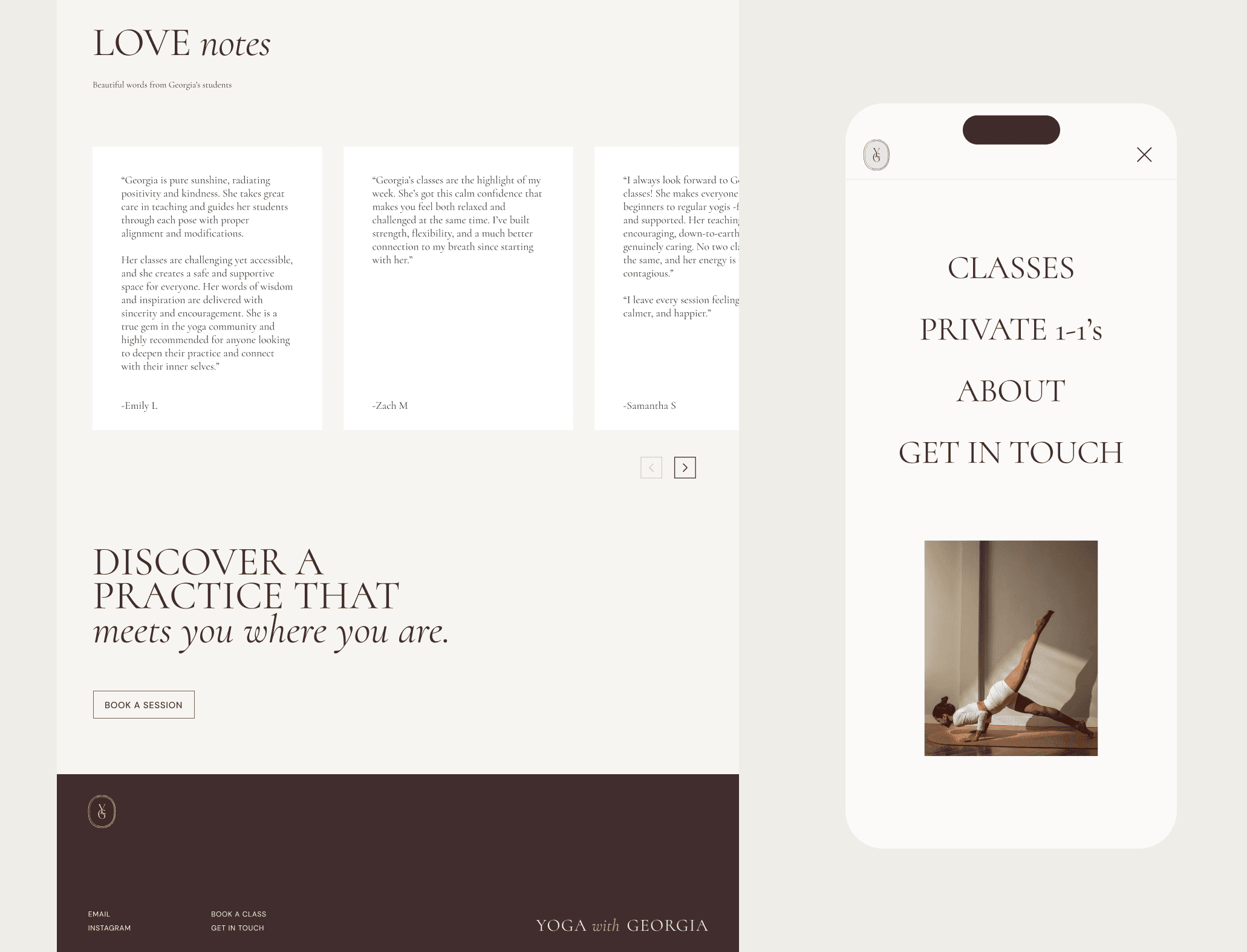Yoga with Georgia needed a simple, welcoming digital space to share her services and guide people toward the platforms where they can book group classes or enquire about private 1:1 sessions. Because Georgia is selective about who she works with, the focus was on creating a site that felt personal and invited conversation, rather than pushing people straight into automated booking.